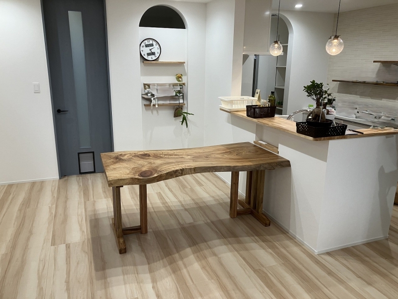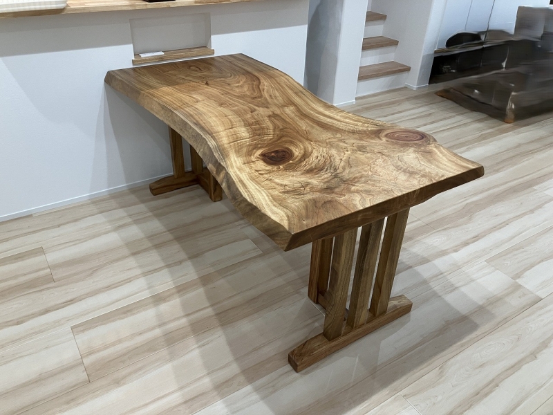 新潟市のA様邸へ167幅一枚板楠材ダイニングテーブル、132幅一枚板栃材フロアテーブルをお届けしました!